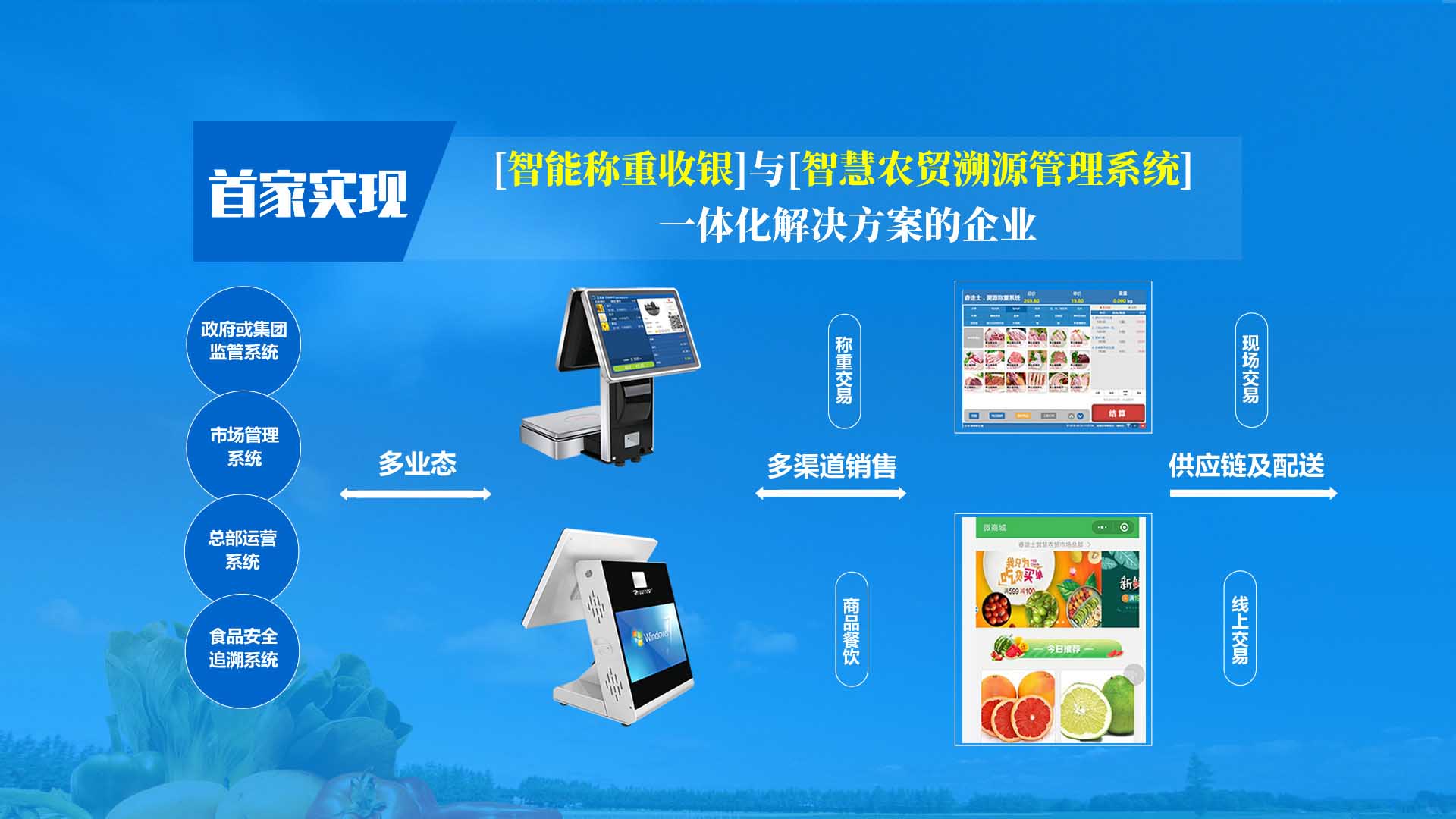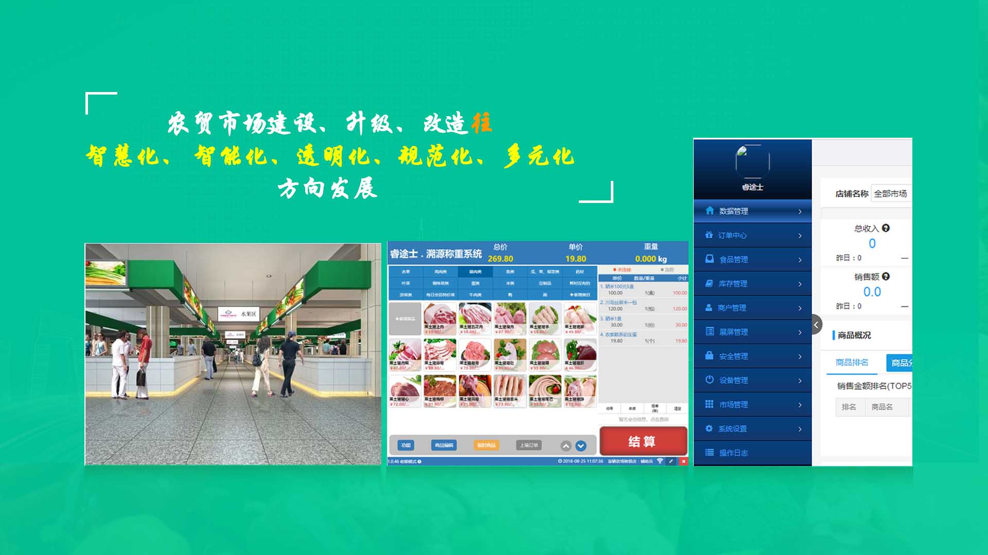創(chuàng)新實現了【智慧農貿溯源管理系統(tǒng)】與【智能稱重收銀】一體化解決方案,集市場管理、運營管理、溯源追溯、智能收銀大數據運用于一體,硬件、軟件與管理系統(tǒng)完美結合。適用于農批、農貿市場蔬菜、生鮮、水果、水產、肉類、熟食等稱重和非稱重銷售;由于采用一體化設計,解決了傳統(tǒng)農貿市場無法實現的信息化、智能化、可追溯的管理問題;使稱重、收銀、追溯、管理、更透明、公正、安全,讓顧客無后顧之憂,給管理工作帶來極大的便捷與高效,對國內農產品行業(yè)的發(fā)展、農產品流通管理起到了典范作用。 【睿途士首創(chuàng)】顛覆傳統(tǒng)的“智慧農貿市場系統(tǒng)”,解決了傳統(tǒng)農貿系統(tǒng)單一安卓掛屏,昂視不方便看、不直觀、無互動性,傳輸信息不齊全、不穩(wěn)定的問題,也解決了按鍵電子秤商品難找、商品代碼難記、按鍵操作不靈活、支付不智能,對收銀管理、銷售商品、菜名、菜價、打折、優(yōu)惠、會員、線上下單、采購等無法實現實際菜品交易和追溯等問題。 更具顛覆性的是睿途士智慧系統(tǒng)擁有三大管理平臺(市場管理平臺、總部運營管理平臺、商戶后臺管理平臺)、一個可視操作前臺和三大追溯功能,讓遠程管理、數據傳輸、人機互動、智能控制、移動支付、大數據、互聯通信、云端存儲、人工智能、智能城市、電子定位、智能收銀等功能得以實現。